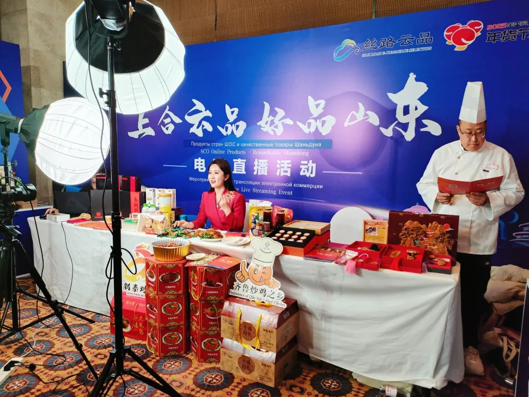 A livestreamer promotes products during a livestreaming session of the SCO online product, remarkable Shandong-E commerce live streaming event. (Photo/Remarkable Shandong)