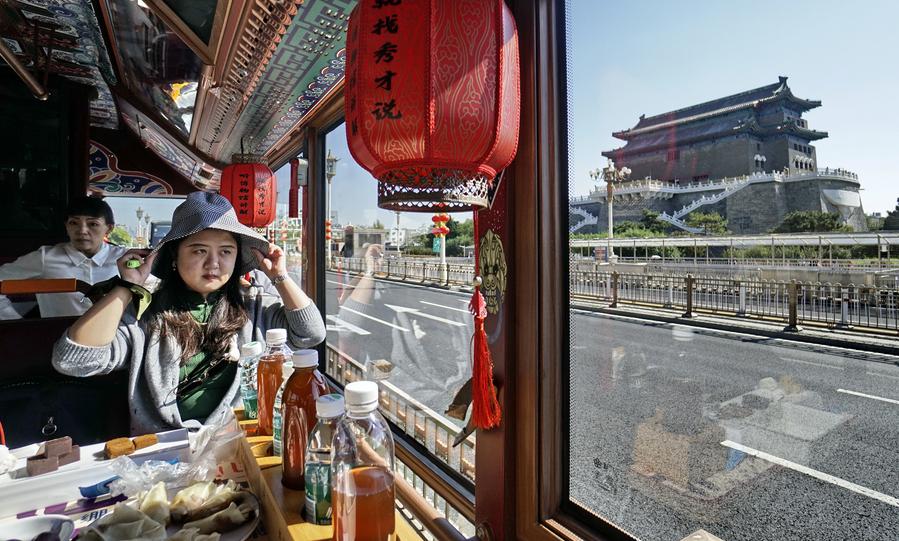Tourists take a Beijing Central Axis sightseeing bus in Beijing, capital of China, Oct. 15, 2024. (Xinhua/Li Xin)