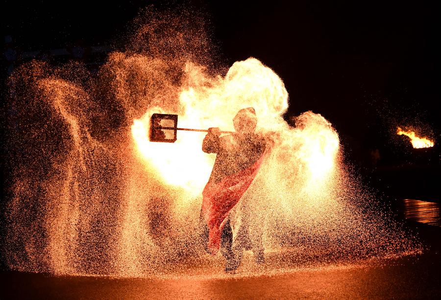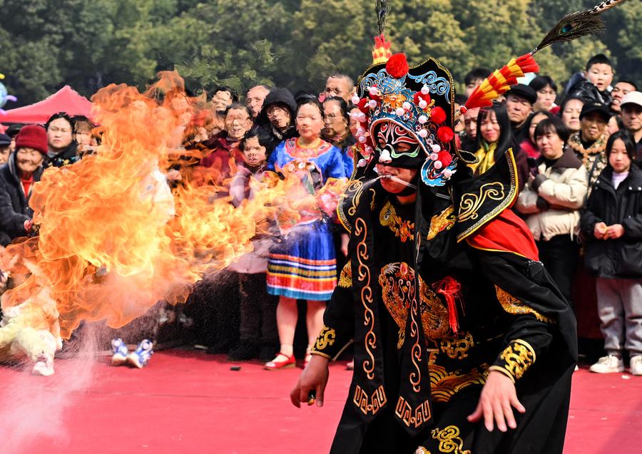 A folk artist performs fire pot show, an intangible cultural heritage, in Wuyi County, Jinhua City, east China's Zhejiang Province, Feb.1, 2025. (Photo by Zhang Jiancheng/Xinhua)