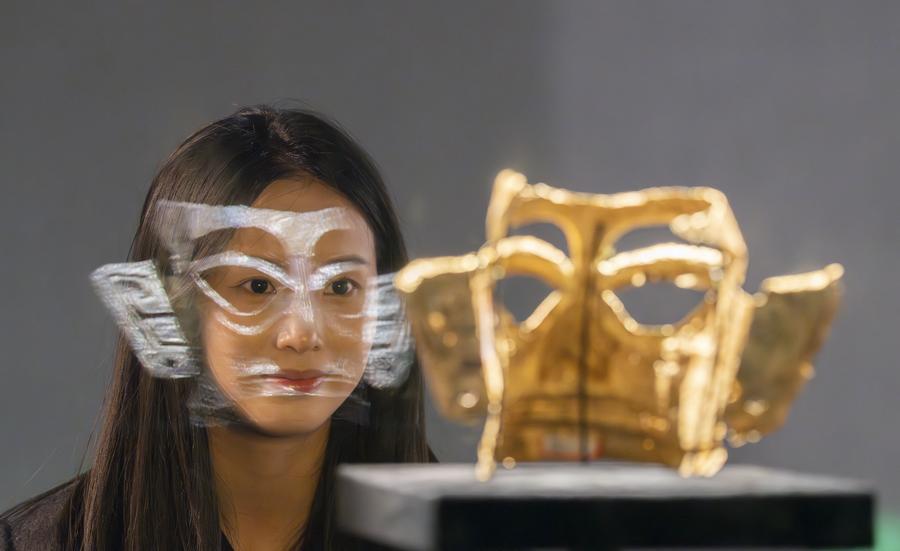 A visitor looks at a golden mask on display in the new building of Sanxingdui Museum in Guanghan City, southwest China's Sichuan Province, Dec. 18, 2024. (Xinhua/Cai Yang)