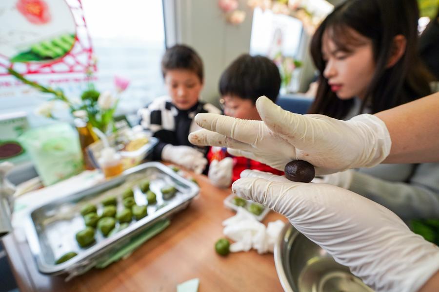 Passengers try to make Qingtuan, green sticky rice balls, on a train passing through Nanjing, east China's Jiangsu Province, April 2, 2024. (Xinhua/Li Bo)