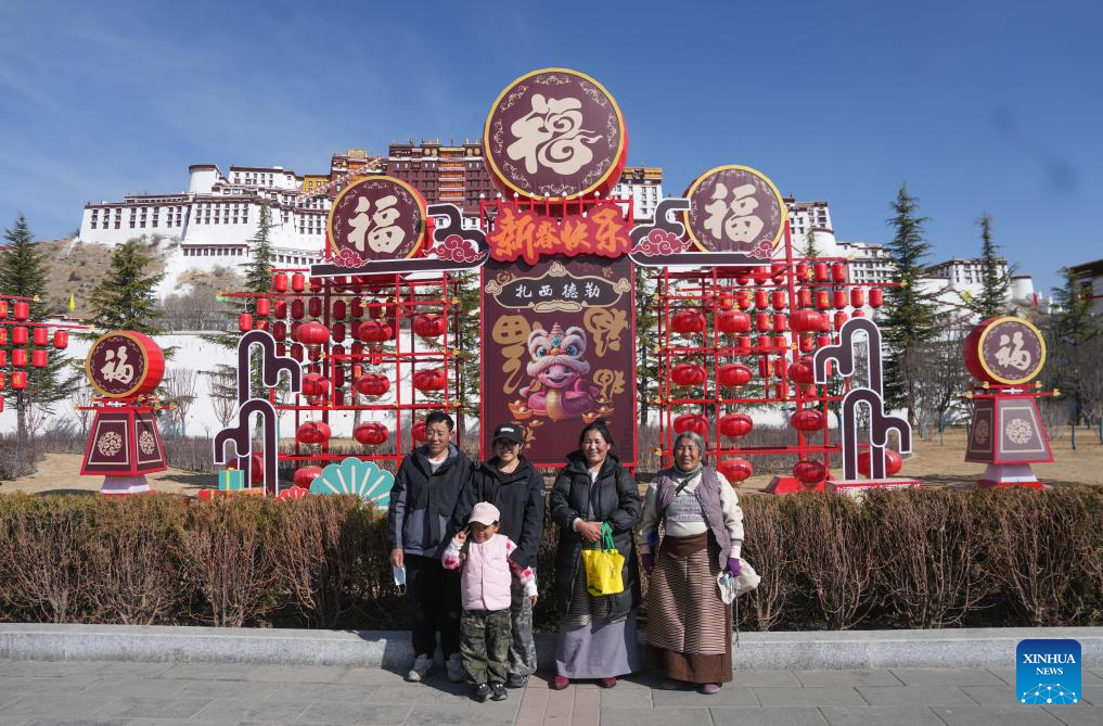 People pose for a group photo in front of the Potala Palace in Lhasa, southwest China's Xizang Autonomous Region, Feb. 28, 2025. Southwest China's Xizang Autonomous Region on Friday welcomed the first day of the Tibetan New Year with a flurry of festive foods, holiday greetings and traditional customs. (Xinhua/Jigme Dorje)