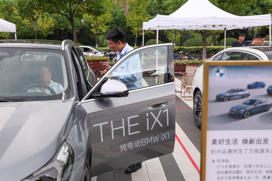 A sales representative (R) introduces an EV product during a trade-in event in Shangcheng District of Hangzhou, east China's Zhejiang Province, Sept. 27, 2024. (Xinhua/Jiang Han)