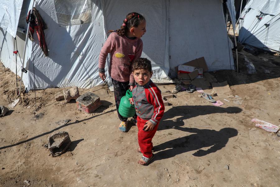 Palestinian children are seen in one of the displacement camps at the Al-Shujaiya neighborhood in Gaza City, on Feb. 25, 2025. (Photo by Rizek Abdeljawad/Xinhua)