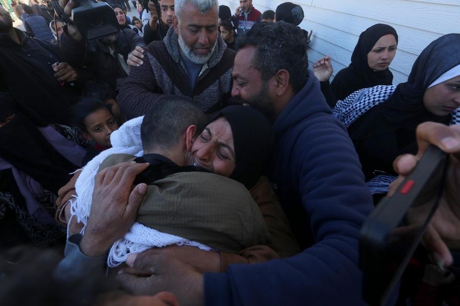 People welcome a released Palestinian prisoner in the southern Gaza Strip city of Khan Younis, on Feb. 27, 2025. Israeli authorities on Thursday began releasing more than 600 Palestinian prisoners from Israeli jails as part of the Gaza ceasefire agreement between Hamas and Israel, according to Palestinian sources. (Photo by Rizek Abdeljawad/Xinhua)