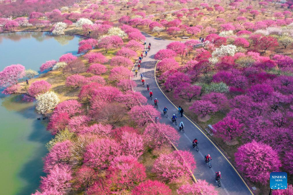 This aerial drone photo shows people cycling among plum blossoms in Changxing County, Huzhou City, east China's Zhejiang Province, March 2, 2025. (Photo by Wu Zheng/Xinhua)