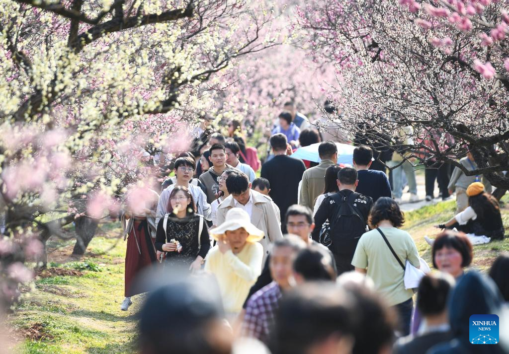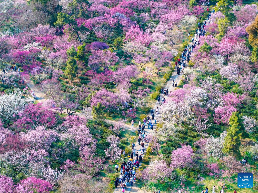 People enjoy the blossoms at Meihua Mountain in Nanjing, east China's Jiangsu Province, March 1, 2025. (Photo by Yang Suping/Xinhua)