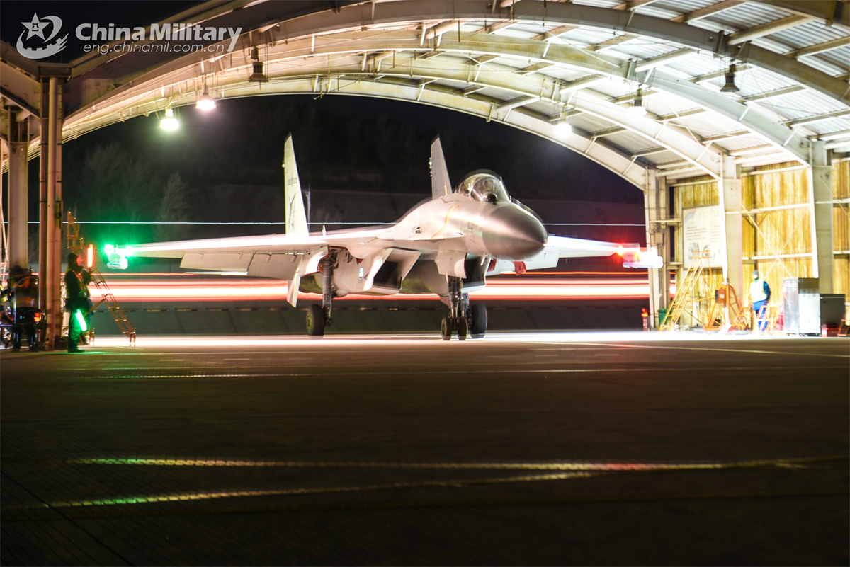 A J-15 carrier-based fighter jet attached to a regiment under the Chinese PLA Naval Aviation University taxis out of the parking apron during an eight-hour day-and-night flight training exercise in northeast China's Liaoning Province on February 20, 2025. (eng.chinamil.com.cn/Photo by Xu Yinglong)