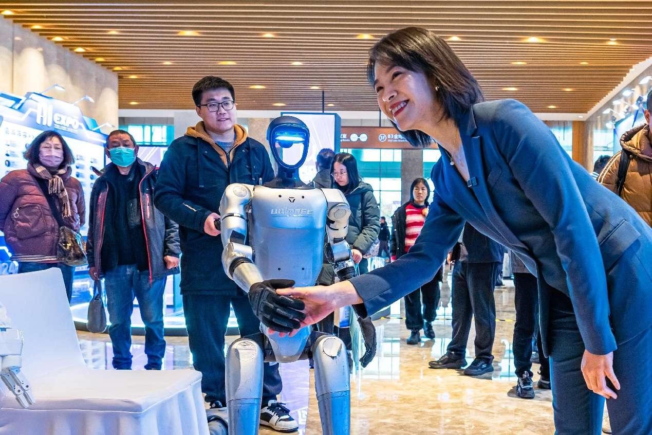 A woman shakes hands with a humanoid robot at the 2024 Global AI Product and Application Expo in Suzhou, east China's Jiangsu province, Dec. 10, 2024. (People's Daily Online/Zhang Feng)
