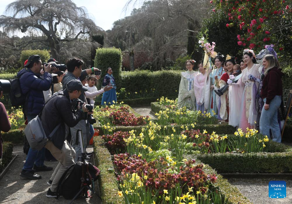 Hanfu enthusiasts pose for photos with tourists during a celebration of the Huazhao Festival, or the flower goddess' birthday, at the Filoli Historic House & Garden in Woodside, California, the United States, March 1, 2025. (Photo by Liu Yilin/Xinhua)