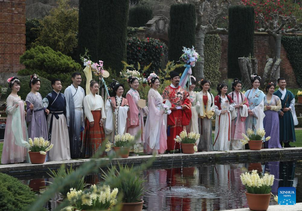Hanfu enthusiasts attend a celebration of the Huazhao Festival, or the flower goddess' birthday, at the Filoli Historic House & Garden in Woodside, California, the United States, March 1, 2025. (Photo by Liu Yilin/Xinhua)