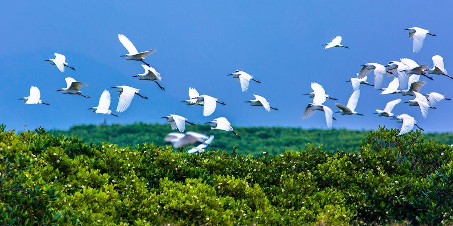 Egrets fly above the Zhangjiangkou National Mangrove Nature Reserve in Yunxiao county, southeast China's Fujian Province. (Photo/Dai Yuansheng)