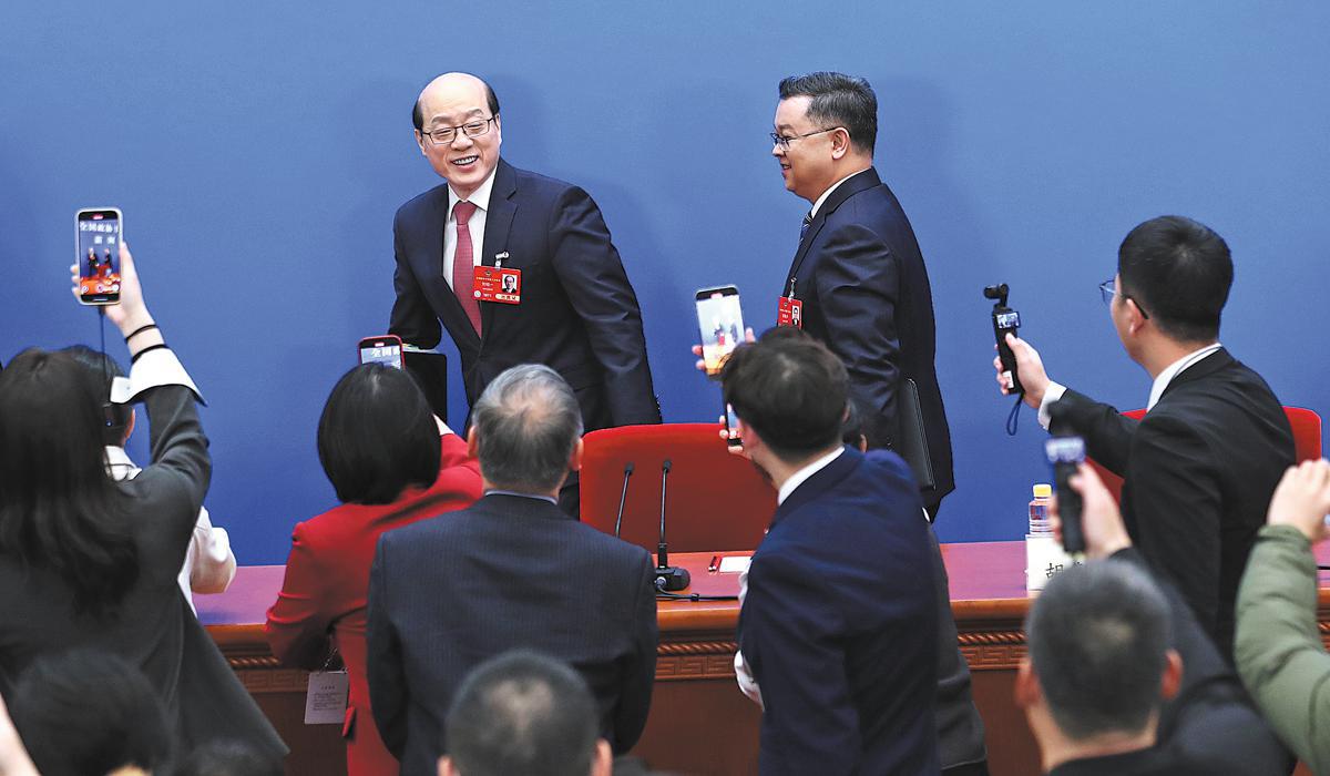Liu Jieyi, the spokesman for the third session of the 14th National Committee of the Chinese People's Political Consultative Conference, interacts with journalists in Beijing on Monday after a news conference on the annual session of the CPPCC National Committee. (Zou Hong/China Daily)