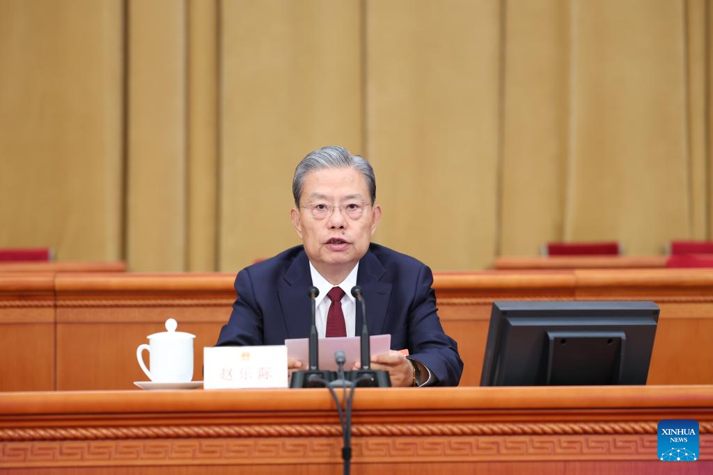 Zhao Leji, chairman of the National People's Congress (NPC) Standing Committee, presides over a preparatory meeting for the third session of the 14th NPC at the Great Hall of the People in Beijing, capital of China, March 4, 2025. (Xinhua/Huang Jingwen)