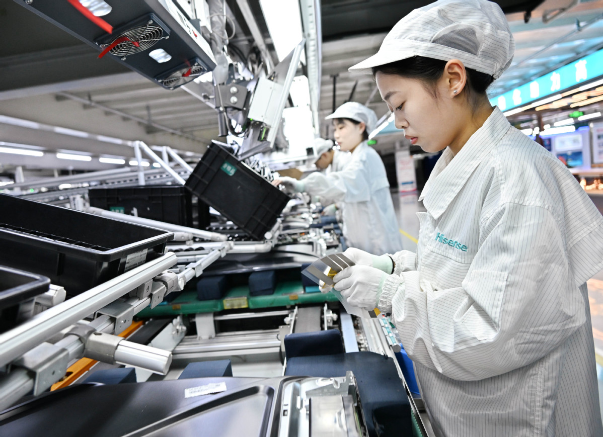 Employees at work on Hisense's TV assembly line in Qingdao, Shandong province. (Li Ziheng/Xinhua)