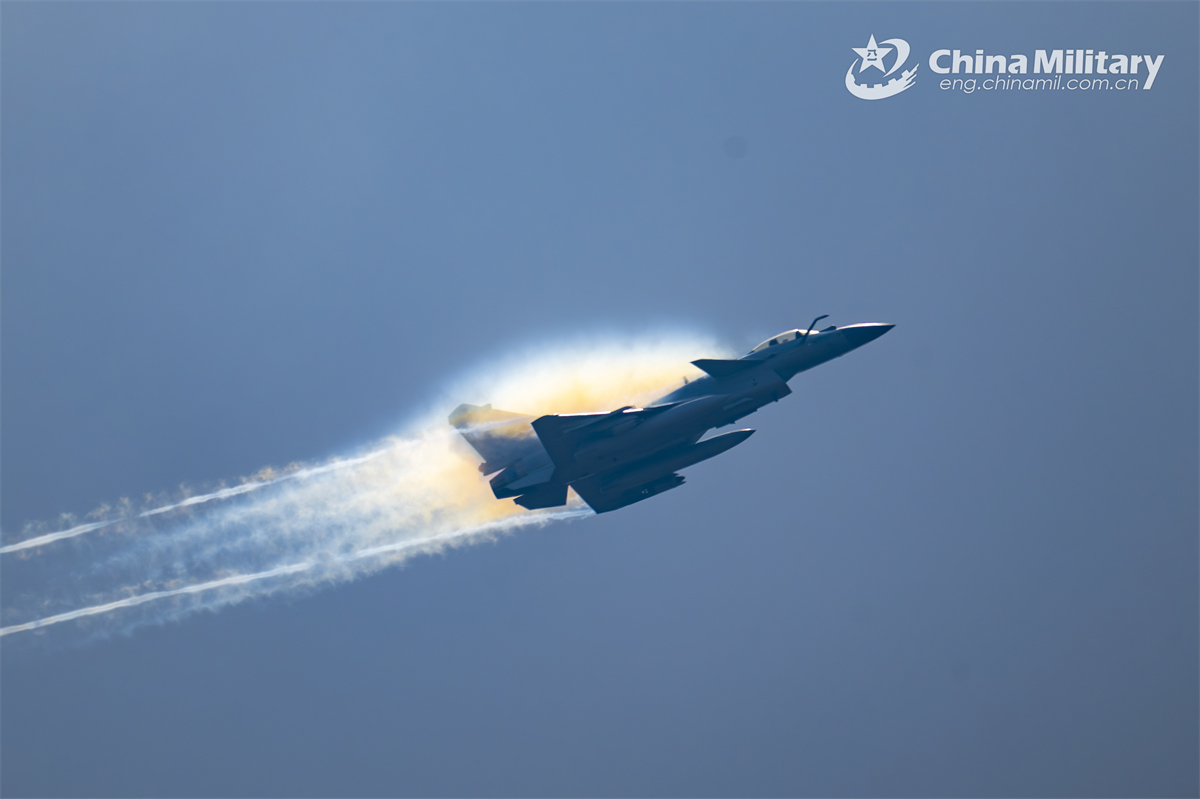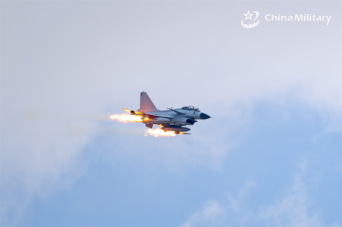 A J-10C fighter jet attached to an aviation brigade with the air force under the Chinese PLA Southern Theater Command speeds up to climb during a round-the-clock flight training exercise in late February 2025. (eng.chinamil.com.cn/Photo by Xiao Rui)