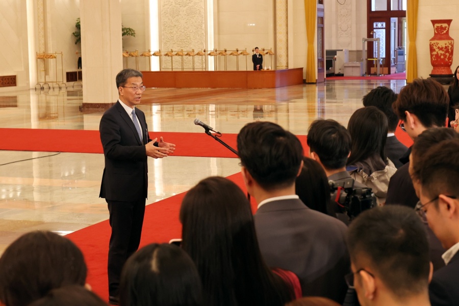 China's Education Minister Huai Jinpeng gives an interview after the opening meeting of the third session of the 14th National People's Congress at the Great Hall of the People in Beijing, on March 5, 2025. (Wang Zhuangfei/chinadaily.com.cn)