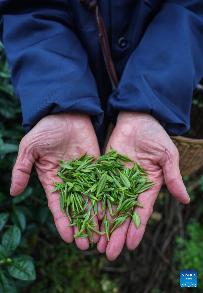 A farmer displays freshly-picked tea leaves at a tea garden in Wangzhai Town of Wuyi County, Jinhua City, east China's Zhejiang Province, March 5, 2025. As spring unfolds, tea gardens across Wuyi County have entered the harvest season. In recent years, Wuyi County has advanced the tea industry as its pillar industry. By the end of 2024, the total area of tea plantation in Wuyi County has reached 125,700 mu (approximately 8,380 hectares). More than 60,000 farmers have directly benefited from tea-related businesses. (Xinhua/Xu Yu)