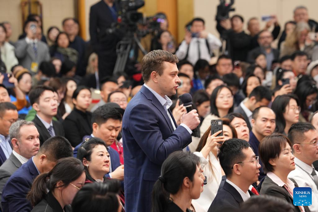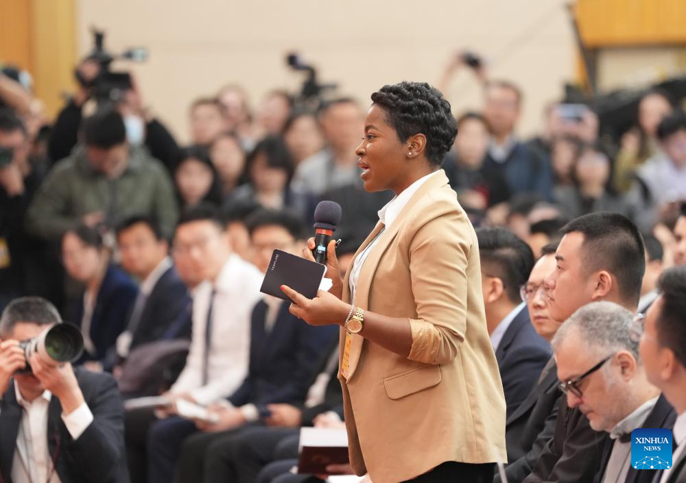 A journalist asks a question at a press conference attended by Chinese Foreign Minister Wang Yi on the sidelines of the third session of the 14th National People's Congress (NPC) in Beijing, capital of China, March 7, 2025. Wang, also a member of the Political Bureau of the Communist Party of China Central Committee, briefed journalists from home and abroad on China's foreign policies and answered questions on a wide range of issues during the press conference on Friday. (Xinhua/Li Xiao)