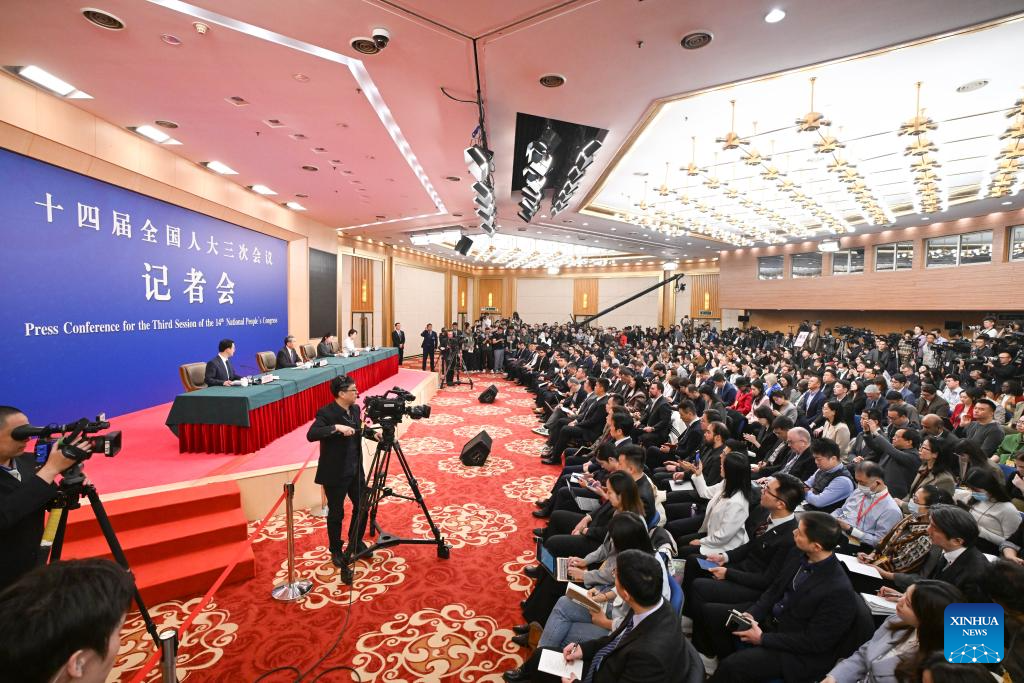 Journalists work at a press conference attended by Chinese Foreign Minister Wang Yi on the sidelines of the third session of the 14th National People's Congress (NPC) in Beijing, capital of China, March 7, 2025. Wang, also a member of the Political Bureau of the Communist Party of China Central Committee, briefed journalists from home and abroad on China's foreign policies and answered questions on a wide range of issues during the press conference on Friday. (Xinhua/Chen Yehua)