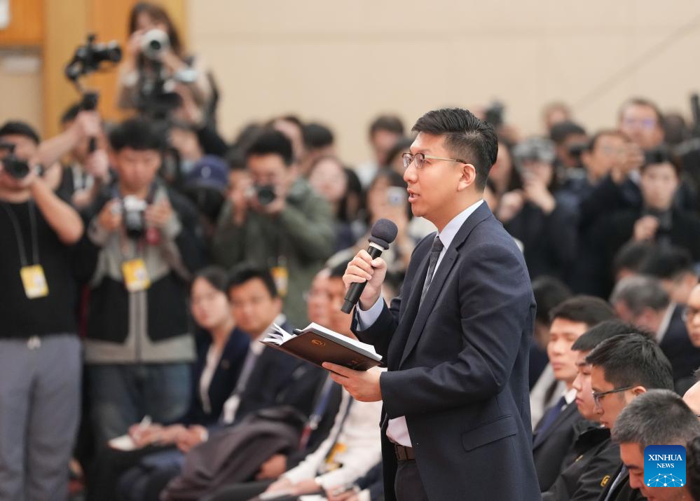 A journalist with Xinhua News Agency asks a question at a press conference attended by Chinese Foreign Minister Wang Yi on the sidelines of the third session of the 14th National People's Congress (NPC) in Beijing, capital of China, March 7, 2025. Wang, also a member of the Political Bureau of the Communist Party of China Central Committee, briefed journalists from home and abroad on China's foreign policies and answered questions on a wide range of issues during the press conference on Friday. (Xinhua/Chen Yehua)