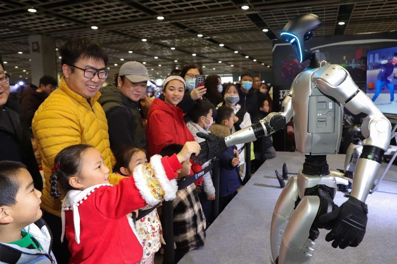 A girl shakes hands with a humanoid robot at the Nanjing International Expo Center in Nanjing, east China's Jiangsu province, Feb. 15, 2025. (People's Daily Online/Li Wenbao)