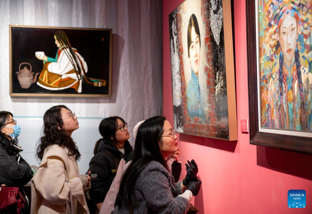 Women look at women-themed artworks at a museum in Fuzhou, southeast China's Fujian Province, on March 7, 2025. Various activities are held across the country to mark the International Women's Day. (Xinhua/Wei Peiquan)