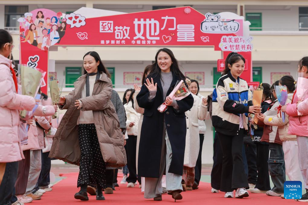 Students present flowers to teachers during an event celebrating the International Women's Day at a primary school in Zaozhuang City, east China's Shandong Province, March 7, 2025. Various activities are held across the country to mark the International Women's Day. (Photo by Wang Longfei/Xinhua)