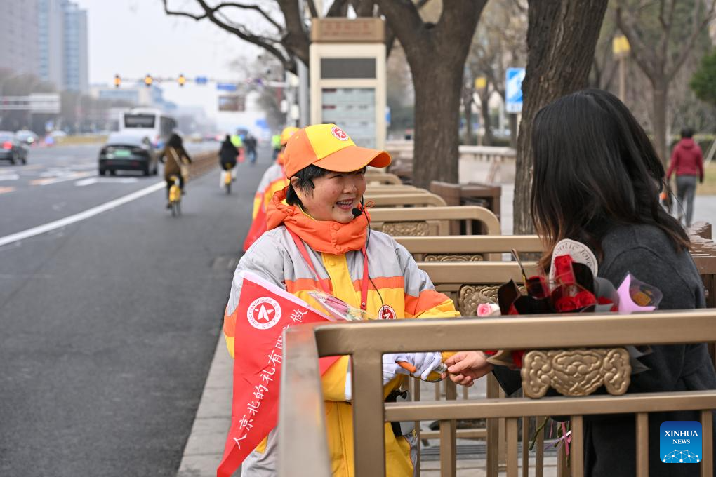 Community workers present flowers to volunteers (1st &2nd L) near a subway station in Dongcheng District in Beijing, capital of China, March 7, 2025. Various activities are held across the country to mark the International Women's Day. (Xinhua/Li Xin)
