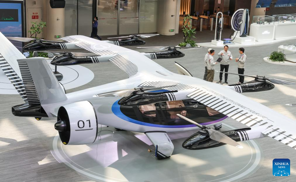 Feng Xingya (2nd R), a deputy to the 14th National People's Congress (NPC), learns about the GOVY AirJet, GAC Group's first composite-wing flying car, in Guangzhou, south China's Guangdong Province, Feb. 24, 2025.(Xinhua/Liu Dawei)