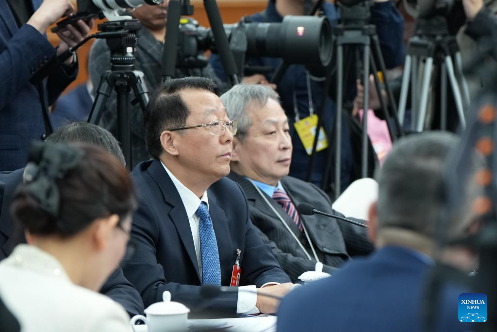 Feng Xingya (C), a deputy to the 14th National People's Congress (NPC), attends a group meeting of the delegation of Guangdong Province at the third session of the 14th NPC in Beijing, capital of China, March 6, 2025.(Xinhua/Liu Dawei)