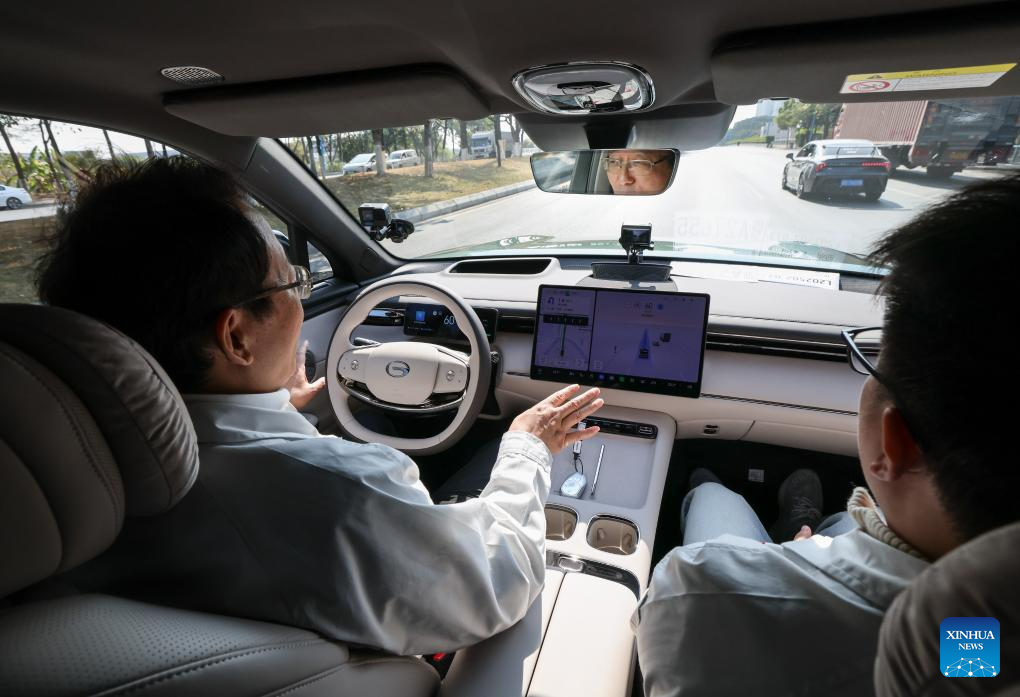 Feng Xingya (L), a deputy to the 14th National People's Congress (NPC), learns about the intelligent driving system of a car to be launched in Guangzhou, south China's Guangdong Province, Feb. 24, 2025.(Xinhua/Liu Dawei)