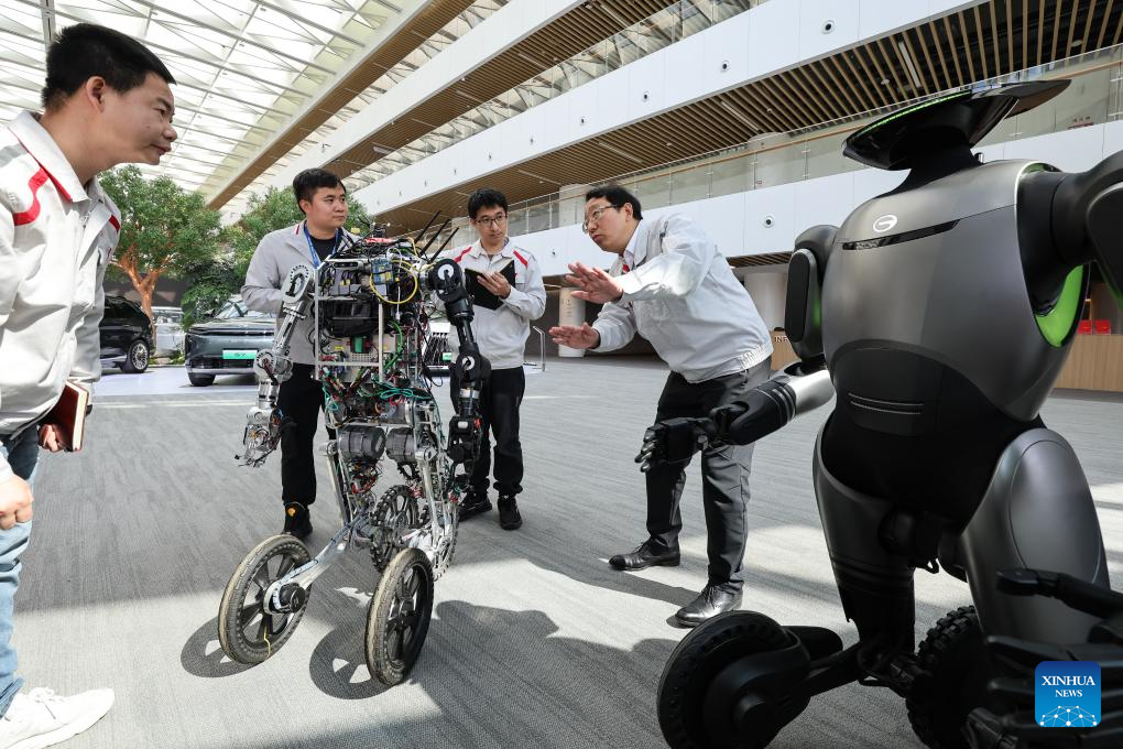 Feng Xingya (1st R), a deputy to the 14th National People's Congress (NPC), learns about a robot with AI technology in Guangzhou, south China's Guangdong Province, Feb. 24, 2025.(Xinhua/Liu Dawei)