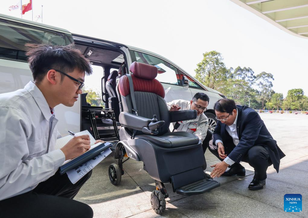 Feng Xingya (R), a deputy to the 14th National People's Congress (NPC), examines an electric seat in Guangzhou, south China's Guangdong Province, Feb. 24, 2025.(Xinhua/Liu Dawei)