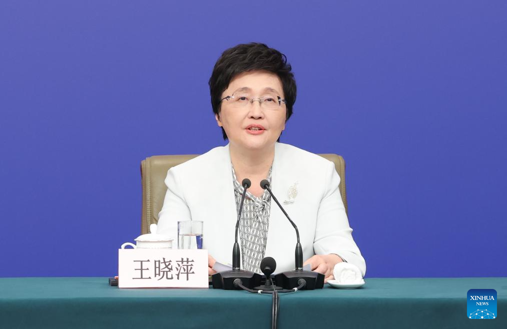 China's Minister of Human Resources and Social Security Wang Xiaoping attends a press conference on people's livelihood for the third session of the 14th National People's Congress (NPC) in Beijing, capital of China, March 9, 2025. Minister of Civil Affairs Lu Zhiyuan, Minister of Housing and Urban-Rural Development Ni Hong, and head of the National Health Commission Lei Haichao also attended the press conference on Sunday. (Xinhua/Lyu Shuai)