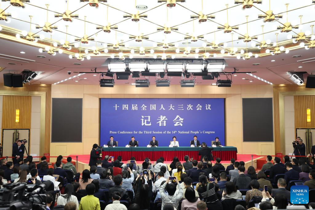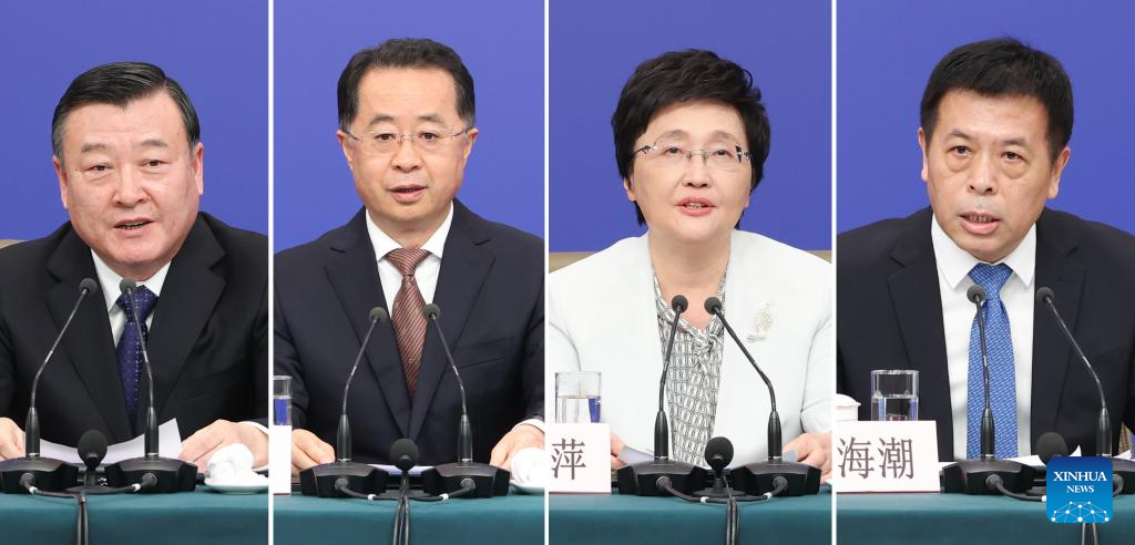 China's Minister of Civil Affairs Lu Zhiyuan, Minister of Human Resources and Social Security Wang Xiaoping, Minister of Housing and Urban-Rural Development Ni Hong, and head of the National Health Commission Lei Haichao attend a press conference on people's livelihood for the third session of the 14th National People's Congress (NPC) in Beijing, capital of China, March 9, 2025. (Xinhua/Lyu Shuai)
