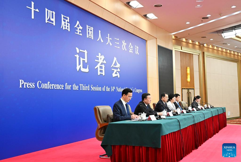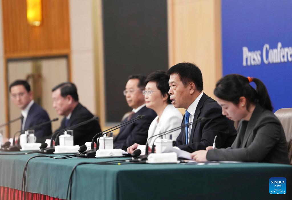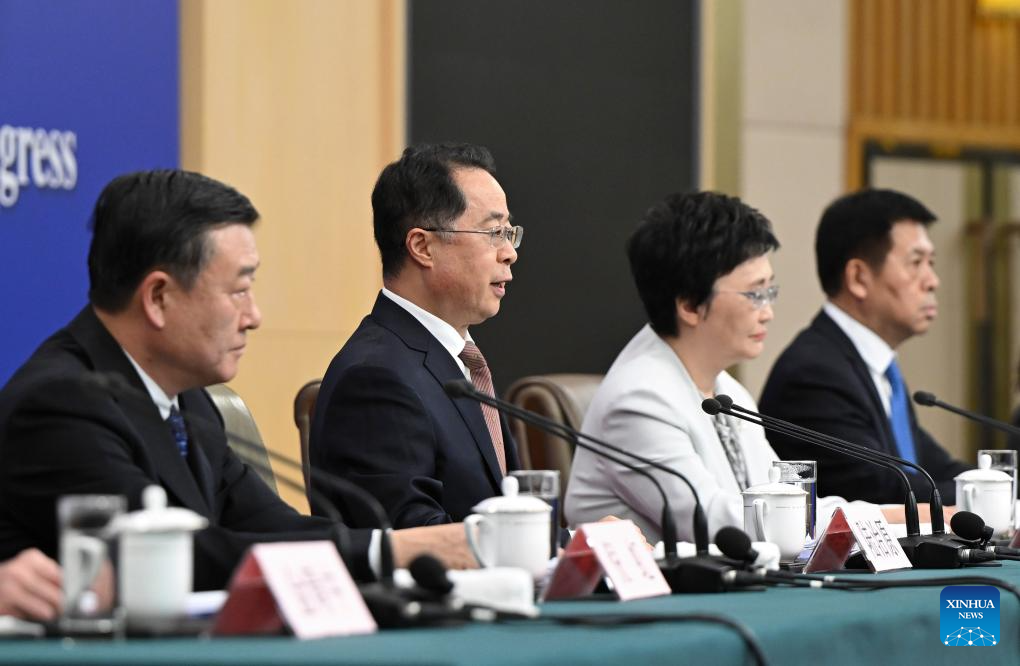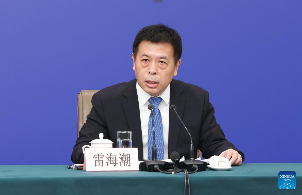 Lei Haichao, head of China's National Health Commission, attends a press conference on people's livelihood for the third session of the 14th National People's Congress (NPC) in Beijing, capital of China, March 9, 2025. Minister of Civil Affairs Lu Zhiyuan, Minister of Human Resources and Social Security Wang Xiaoping, and Minister of Housing and Urban-Rural Development Ni Hong also attended the press conference on Sunday. (Xinhua/Lyu Shuai)