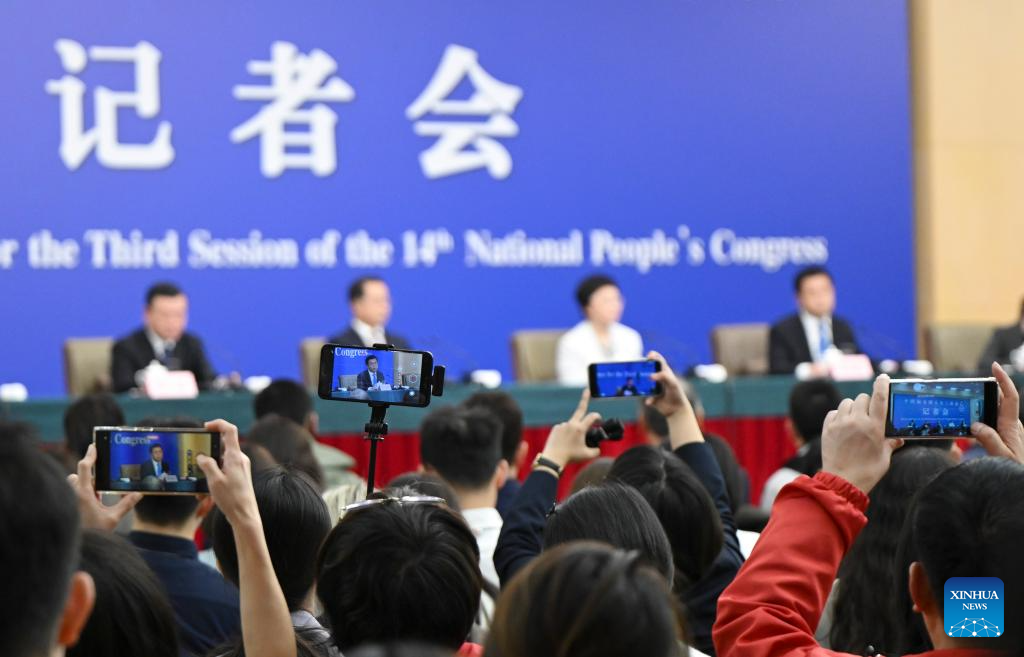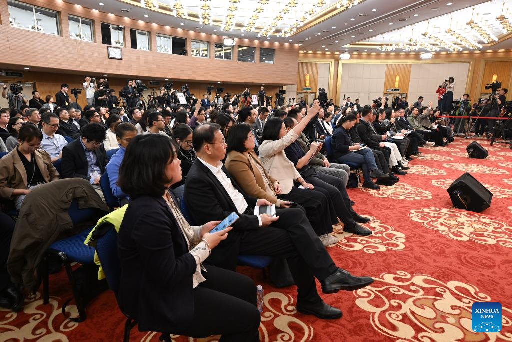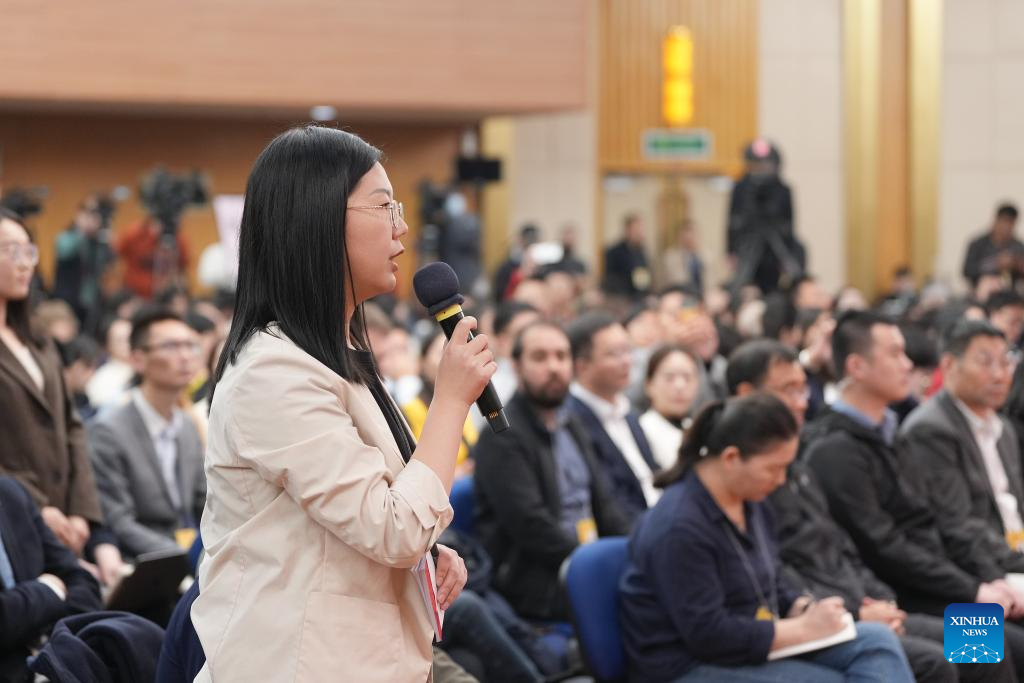 A journalist asks a question at a press conference on people's livelihood for the third session of the 14th National People's Congress (NPC) in Beijing, capital of China, March 9, 2025. China's Minister of Civil Affairs Lu Zhiyuan, Minister of Human Resources and Social Security Wang Xiaoping, Minister of Housing and Urban-Rural Development Ni Hong, and head of the National Health Commission Lei Haichao attended the press conference on Sunday. (Xinhua/Xu Bingjie)