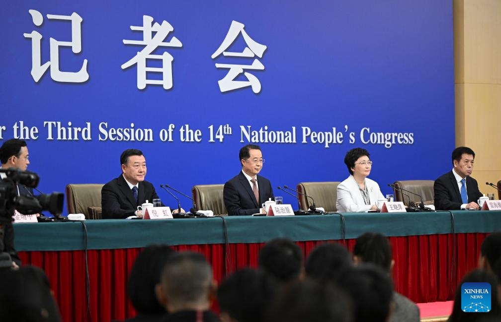 China's Minister of Civil Affairs Lu Zhiyuan attends a press conference on people's livelihood for the third session of the 14th National People's Congress (NPC) in Beijing, capital of China, March 9, 2025. Minister of Human Resources and Social Security Wang Xiaoping, Minister of Housing and Urban-Rural Development Ni Hong, and head of the National Health Commission Lei Haichao also attended the press conference on Sunday. (Xinhua/Lyu Shuai)