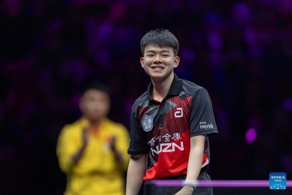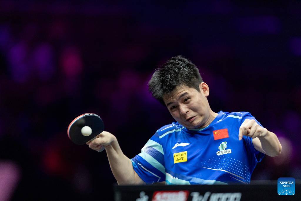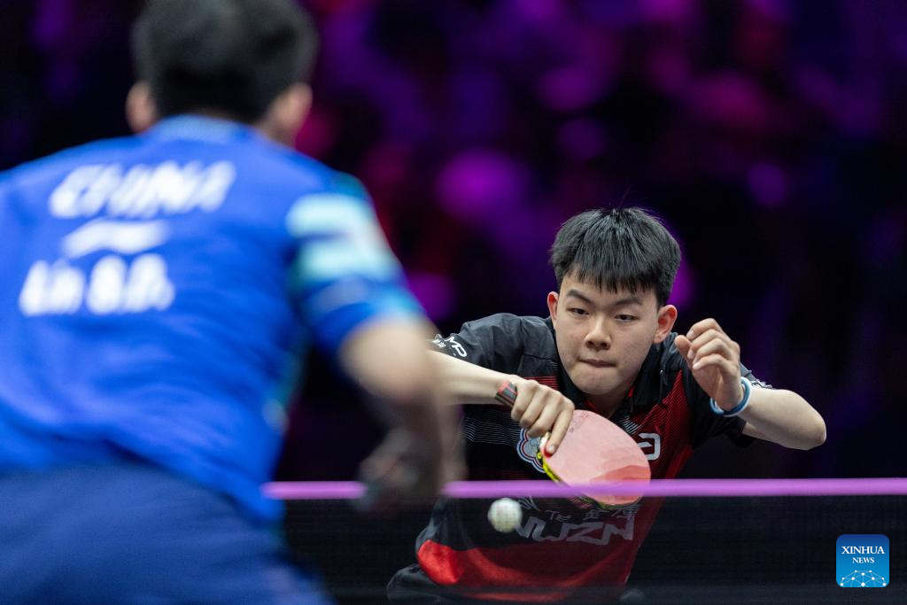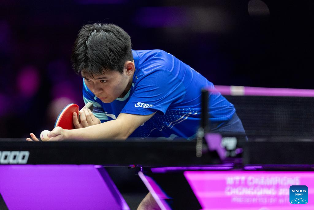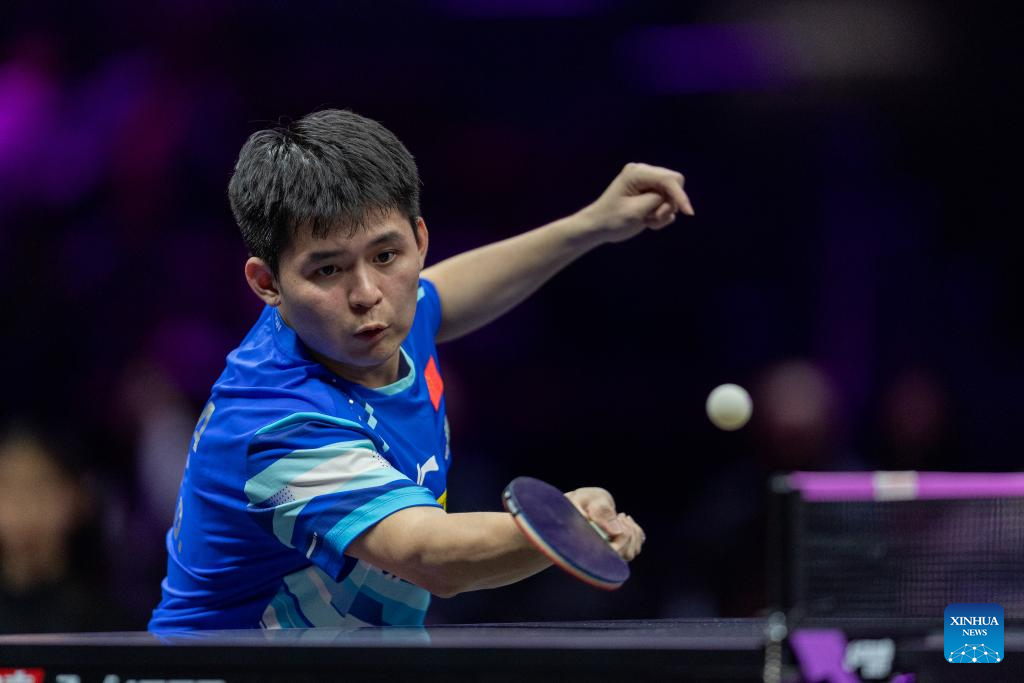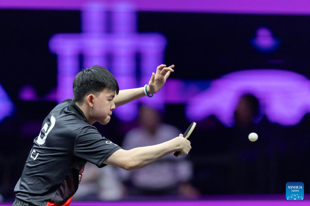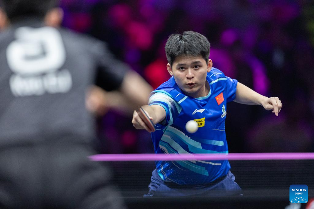 Lin Shidong of China hits a return during the men's singles round of 32 match against Kao Cheng-Jui of Chinese Taipei at the WTT Champions Chongqing 2025 in southwest China's Chongqing, March 11, 2025. (Xinhua/Huang Wei)