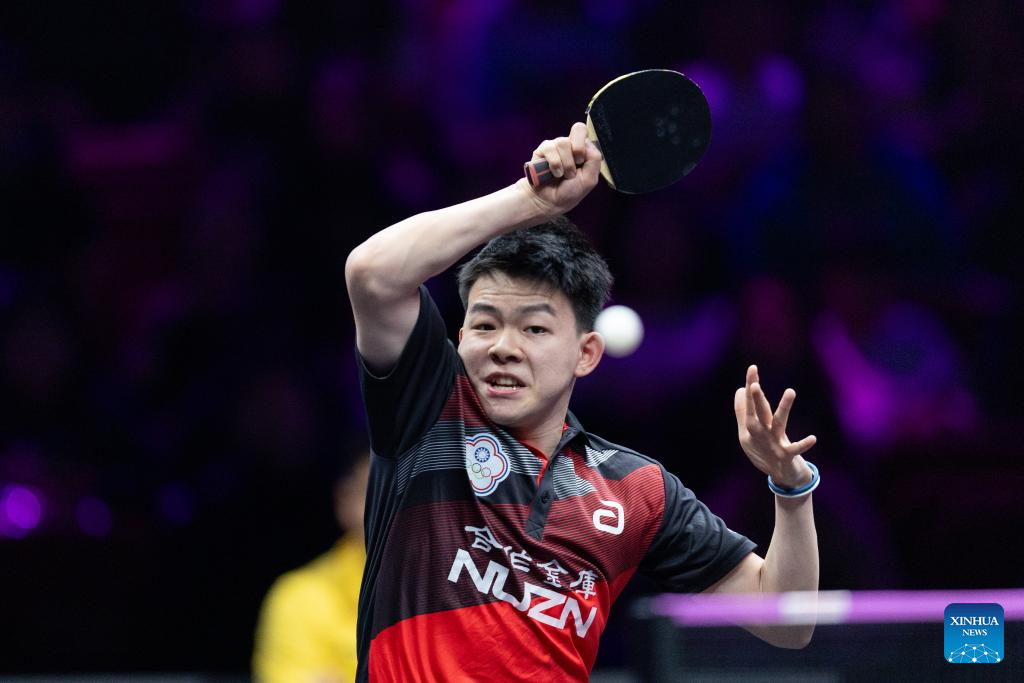 Kao Cheng-Jui of Chinese Taipei hits a return during the men's singles round of 32 match against Lin Shidong of China at the WTT Champions Chongqing 2025 in southwest China's Chongqing, March 11, 2025. (Xinhua/Huang Wei)
