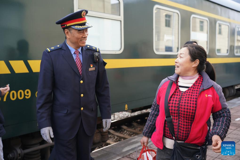 Xiang Baolin, chief conductor of the No. 6064 train (L), talks to a woman outside the train at Yanzibian Station in northwest China's Shaanxi Province, Feb. 17, 2025. (Xinhua/Shao Rui)