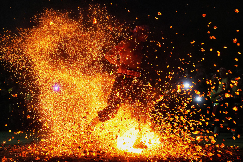 As night fell, a group of barefoot Lisu performers stepped forward to cross the "sea of flames." With steely determination, they let out a thunderous shout, and plunged into the flames.