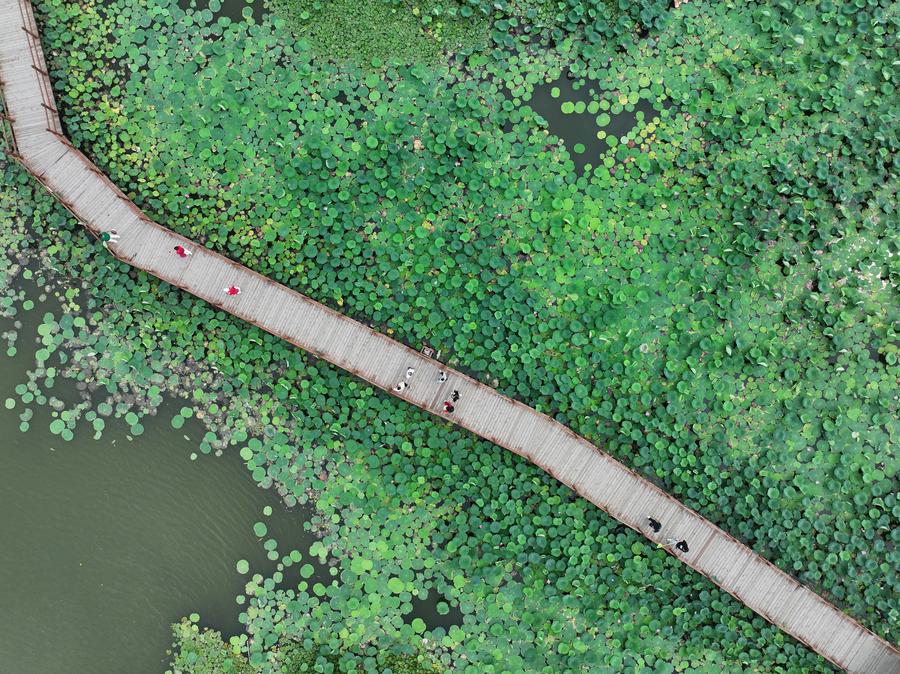 An aerial drone photo taken on July 9, 2024 shows people visiting a lotus-themed park at Baiyangdian Lake in Xiong'an New Area, north China's Hebei Province. (Xinhua/Mu Yu)