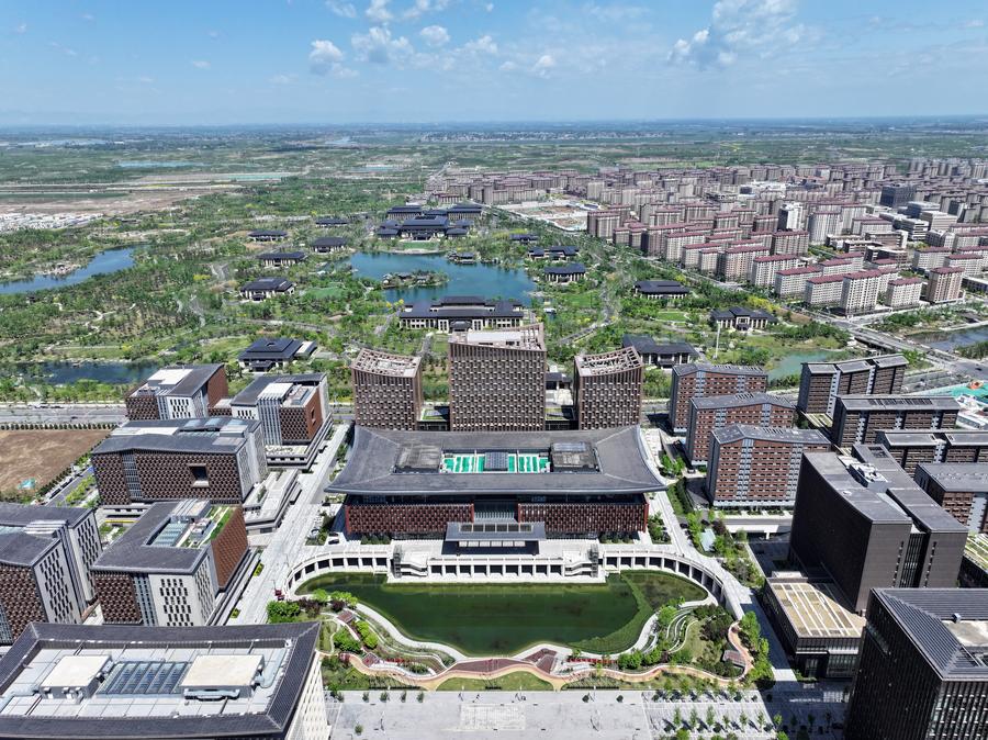An aerial drone photo taken on April 23, 2024 shows the business service center in Xiong'an New Area, north China's Hebei Province. (Xinhua/Mu Yu)