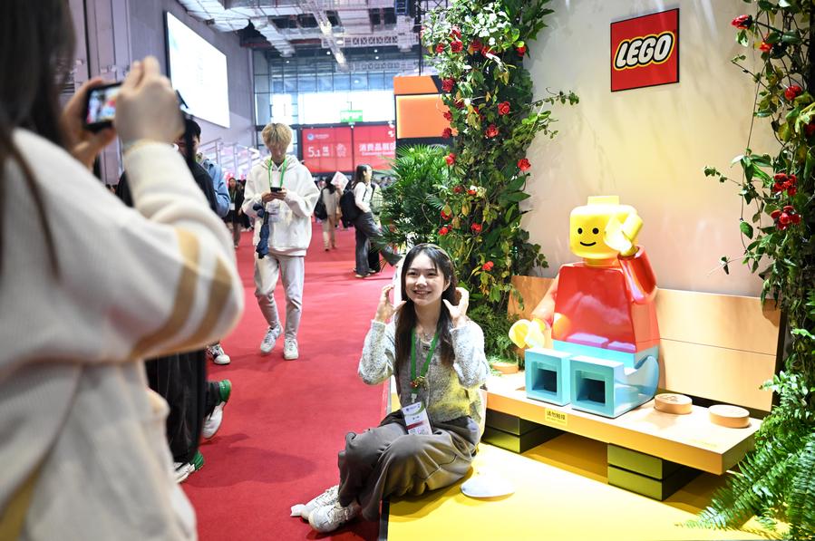 A visitor poses for photos at the booth of LEGO Group, a full-time attender of the China International Import Expo (CIIE), during the 7th CIIE in east China's Shanghai, Nov. 9, 2024. (Photo by Chen Haoming/Xinhua)