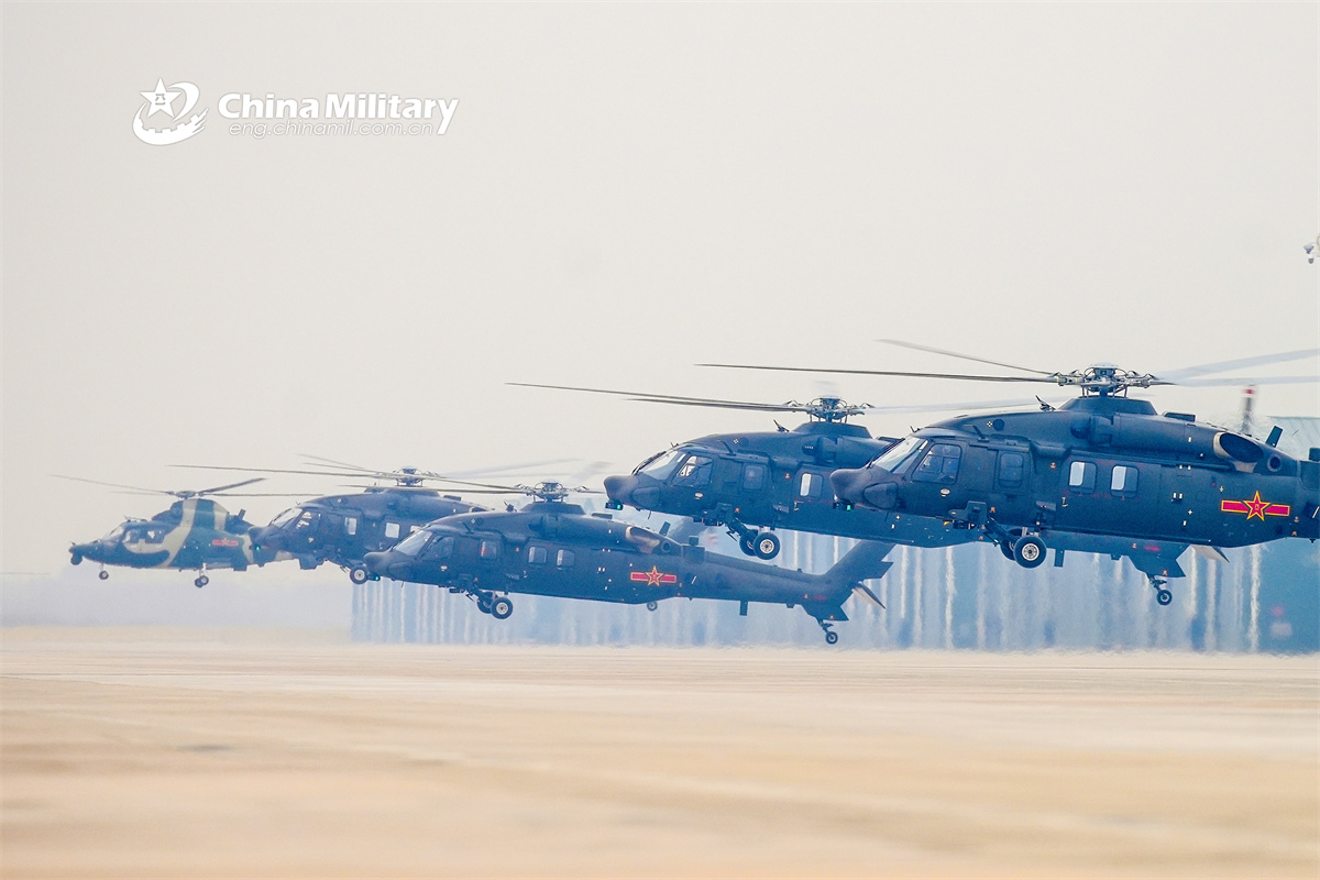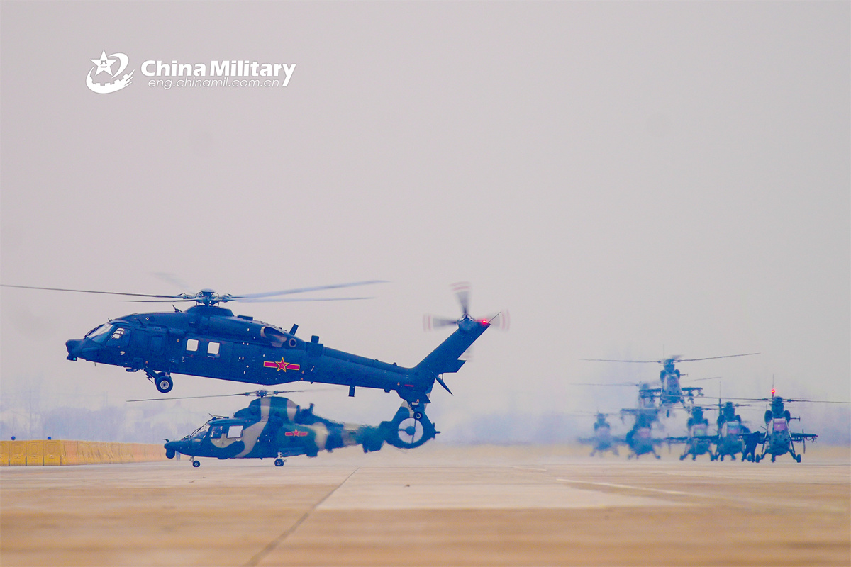 Multi-type army helicopters attached to a brigade under the Chinese PLA Army lift off successively for a flight training exercise in late February 2025. (eng.chinamil.com.cn/Li Jingyou)