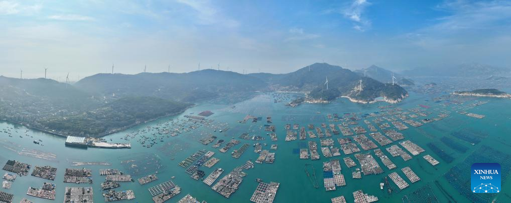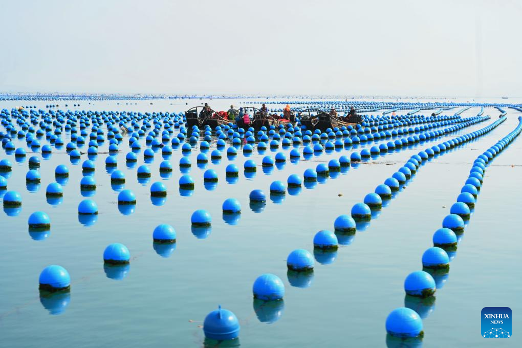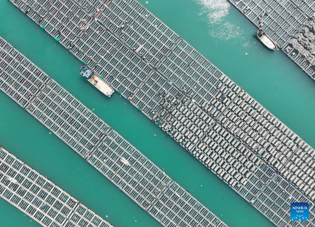 An aerial drone photo shows a panoramic view of an abalone breeding area in Lianjiang County, southeast China's Fujian Province, March 12, 2025. As the weather warms up, fishermen in Lianjiang start abalone farming and sowing. (Xinhua/Lin Shanchuan)