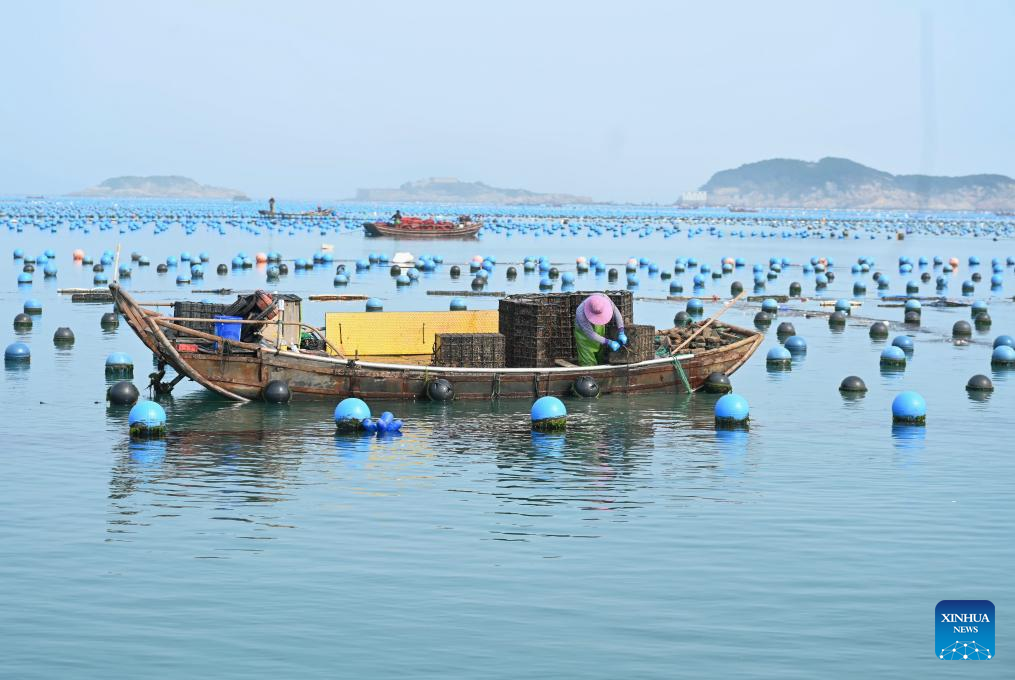 Fishermen feed abalones in Lianjiang County, southeast China's Fujian Province, March 12, 2025. As the weather warms up, fishermen in Lianjiang start abalone farming and sowing. (Xinhua/Lin Shanchuan)