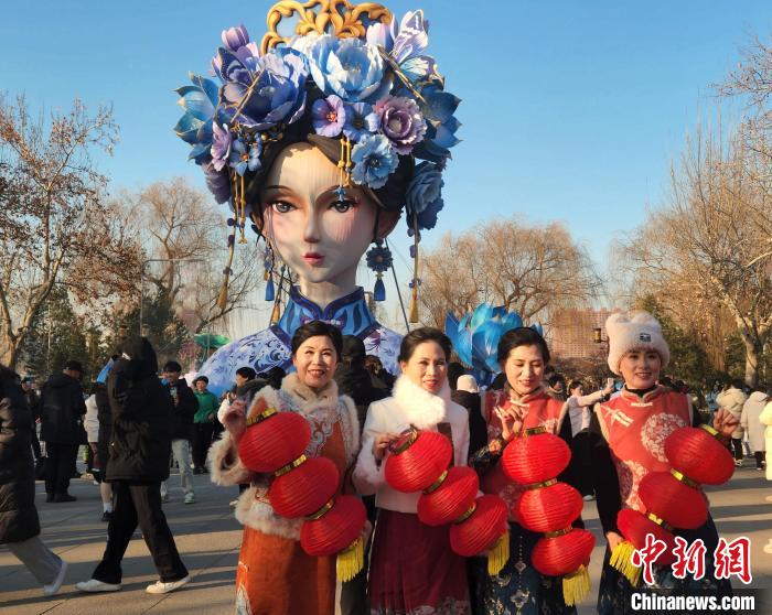 Four female tourists pose for photos in front of a woman-shaped lantern in the Daming Lake scenic spot in Jinan, east China's Shandong Province, Jan. 10, 2025. (China News Service/Zhao Xiao)